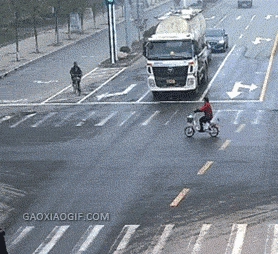 突然间,货车开始倒车,有可能是走错了路。电动车刚好处在大货车的视线盲区内。