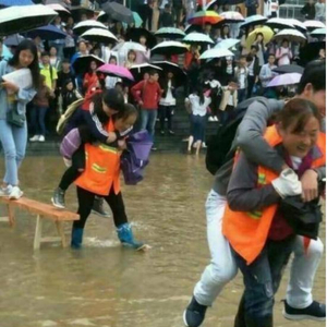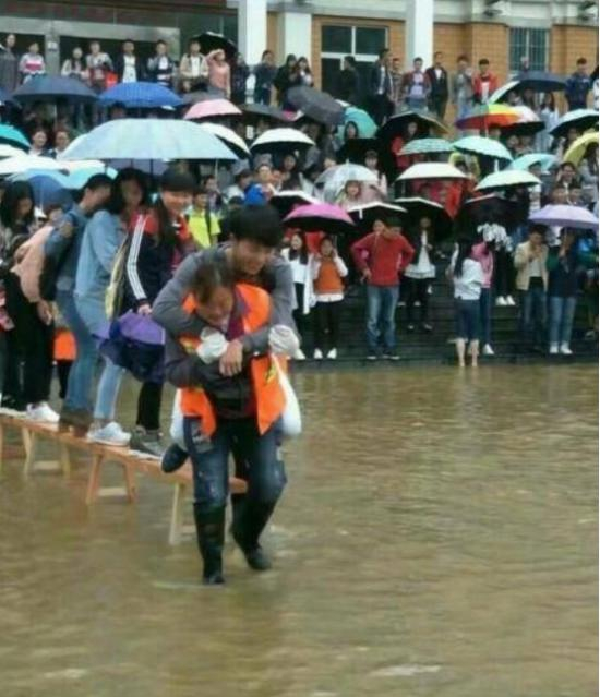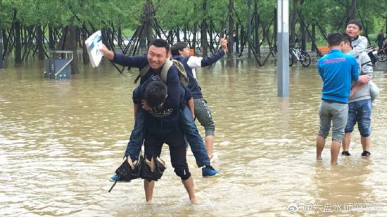 昨日(14日)贵州部分地区降暴雨,六盘水师范学院低洼地带形成积水。视频中的“环卫工”实为该校清洁工。6月15日上午,校方安排8名清洁工用长凳在主教学楼前搭起了“水中桥”,并在水中来回背着学生过“河”,此举引发网友热议,被称为今日网上“最火照片”。背人清洁工阿姨对此回应称“你们别怪他(被指责学生),是我走过去把他一把拉在背上就走的。”
