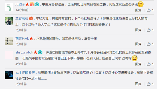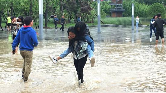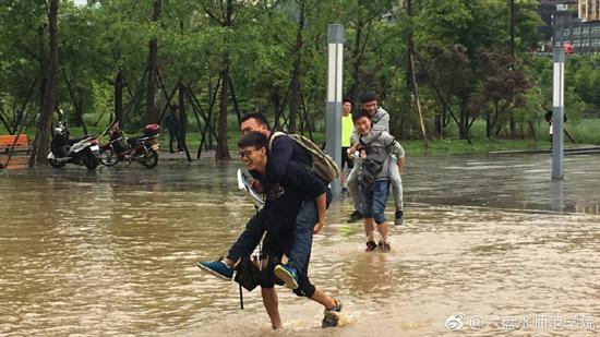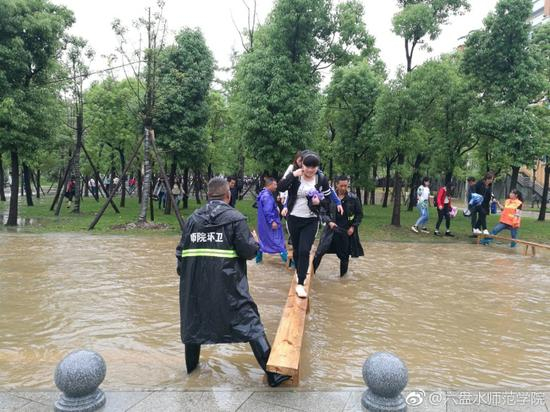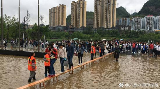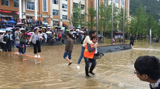 上午11时16分,@六盘水师范学院 官方微博也发了一组相关微博。从图中可见,现场也有女学生背着女学生、男生背着男生淌过水洼的。也有学生是卷着裤腿自己蹚水过“河”。