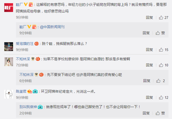 此举引发网友热议,觉得学生都是年轻力壮的,不应该让清洁阿姨背。