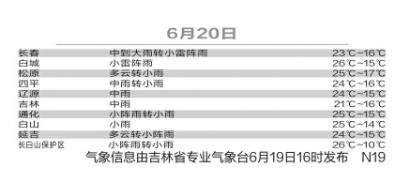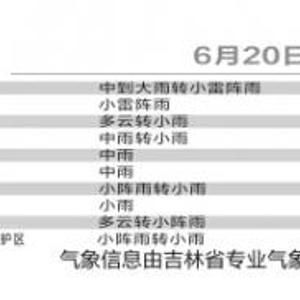 长春市气象局昨天有一组抄送各部门的红头文件———《降水预报》,19日夜间到21日白天,长春市有一次明显降水天气过程,全市平均降水量为15~25毫米,降水主要集中在20日早晨到傍晚,大部分地区有中到大雨。其中市区、双阳、九台、榆树局部地方有暴雨,降雨期间部分地方可能伴有雷电、冰雹、雷暴大风、短时强降水等强对流天气。
