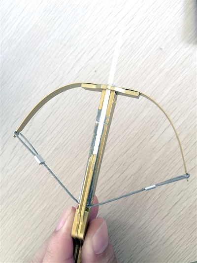 此外,在探访牙签弩时,记者还意外的在汇龙小学附近发现了一家玩具店,在售卖更为逼真的弓弩玩具——木制弓弩。“这个玩具25元,造型跟真的弓弩一模一样,只是要小一些。”老板介绍,这款木制弓弩长度约70厘米,宽度50厘米左右,尾部以一根白色的皮筋线作弦,配有三根箭矢。