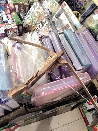 记者又进入旁边一家商店,再次询问是否有牙签弩卖时,店主没有理会。不过,记者在玩具堆里看到有3个牙签弩,记者提出想购买一个时,店主回答:“10元一个。”
