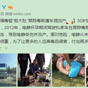 [怀孕女缉毒警“挺大肚”跟踪毒贩遭车祸流产] 36岁的喻静是大连市禁毒支队副大队长,2012年,喻静怀孕期间驾驶私家车在跟踪毒贩车辆时,遭到另一辆汽车猛烈撞击,导致喻静受伤并流产。面对危险,喻静从未退缩,她说:缉毒警肩上的使命很重,为了让更多的人远离毒品侵害,付出再多都值得。