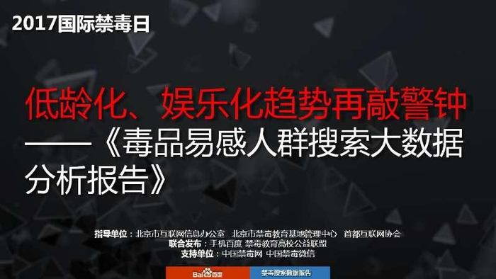 央视网消息:昨天(6月26日)是国际禁毒日,北京市网信办联合北京市禁毒教育基地管理中心等单位联合发布《毒品易感人群搜索大数据分析报告》。报告显示,毒品易感人群呈现低龄化趋势。同时,不少年轻人以娱乐心态看待明星吸毒事件,对毒品危害认识严重不足。