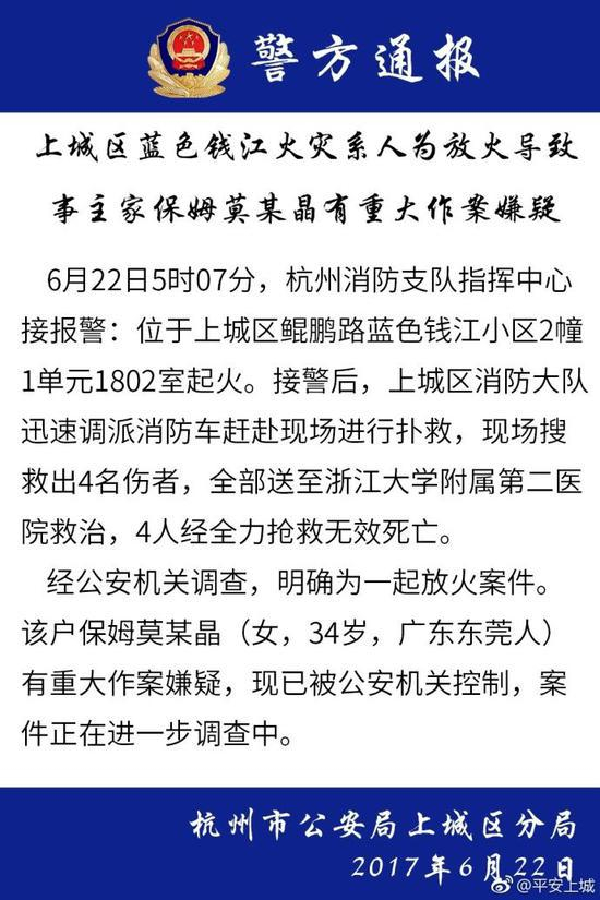 中国小康网讯 余力 6月22日,据杭州市公安局上城分局通报,上城蓝色钱江火灾系人为放火导致,火灾导致4人死亡,事主家保姆莫某晶有重大作案嫌疑,已被警方控制。
