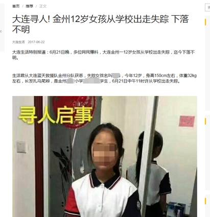 首先,也是最令人愤怒的是,这个“新闻”中宣称的那名12岁的女主角的真实身份是生活在大连金州区的一名普普通通小学生,而且她是一名真的最近刚刚走失的孩子!