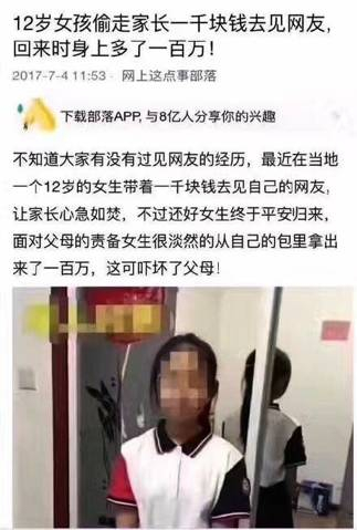 原标题:12岁女孩离家出走见网友,回来时多了100万元?背后真相令人愤怒!