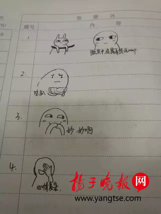 考完试后,柳先頔立刻把试题发上了微博,“太6了!是在下输了!”“好有灵性的试卷”“完蛋,我好像只能画熊猫人那种简单表情”……这张不同寻常的期末考试卷瞬间得到大量转发。