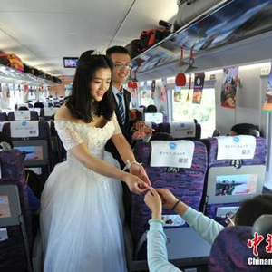 资料图:百对新人宝兰高铁上举行集体婚礼开启蜜月之旅。图为新人向旅客送上喜糖。杨艳敏 摄