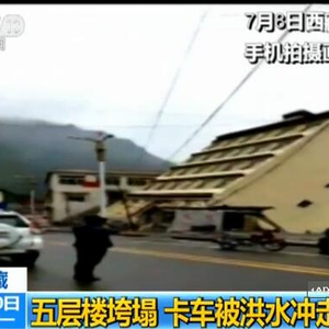 现场:五层楼地基被洪水掏空 整栋倒入江中 人群尖叫声不断