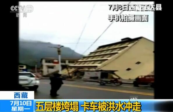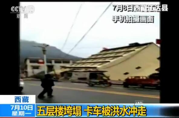 在灾情比较严重的江达县,流经县城的字曲河因强降雨上涨迅猛,7月8日,这栋河边的五层楼房,地基被洪水掏空而出现垮塌。好在,在出现险情之前,江达县已提前疏散了楼内居民,没有人员伤亡。