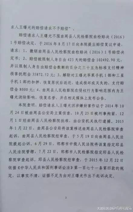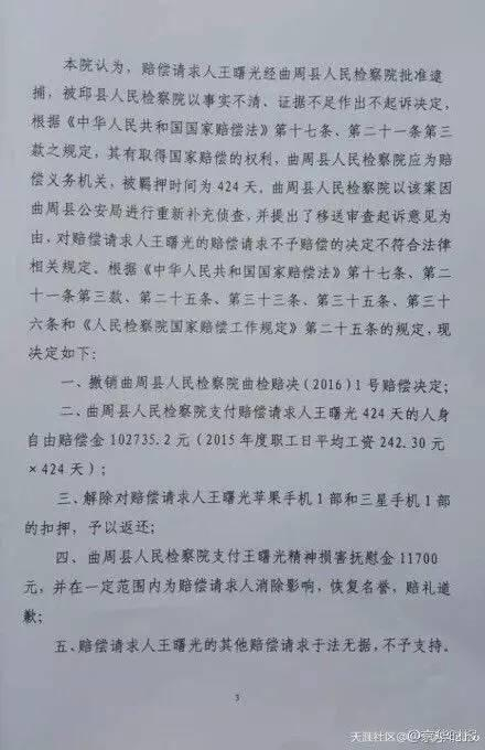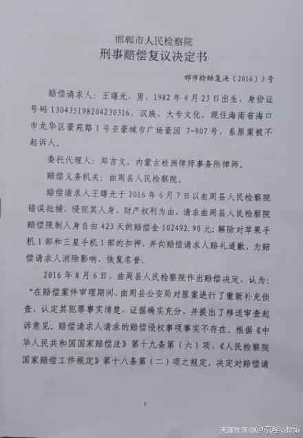 最终,邯郸市检察院于2016年10月15日出具《刑事赔偿复议决定书》,撤销曲周县检察院不予赔偿的决定,并指定曲周县检察院支付王曙光424天的人身自由赔偿金102735.2元,精神损害抚慰金11700元,返还其两部手机,并在一定范围内为其消除影响、恢复名誉、赔礼道歉。