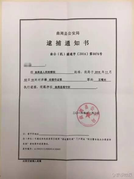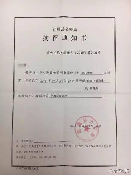 王曙光之妻赵某静向京华时报记者出示的法律文书显示,2016年10月28日,王曙光因涉嫌妨害作证罪再次被曲周县公安局刑事拘留,并于5天后被曲周县检察院以该罪名批准逮捕起诉。