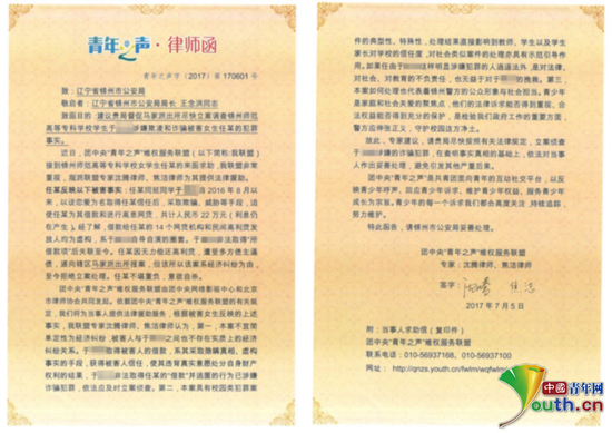 对于上述求助情况,团中央“青年之声”维权服务联盟副主席、北京市律师协会宣联委主任、北京市帅和律师事务所主任、法学博士沈腾认为,本案具有校园类犯罪案件的典型性、特殊性,处理结果直接影响到教师、学生以及学生家长对学校的信任度,对社会类似案件的处理亦具有示范引导作用。7月11日,团中央“青年之声”维权服务联盟向辽宁省锦州市公安局发出律师函,建议锦州市公安局督促凌河分局马家派出所尽快立案调查此事。