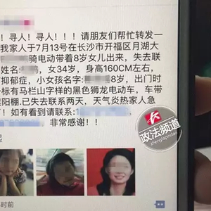 这几天,朋友圈里一直有一则寻人启事在转发,内容是说在7月13日的下午,一位妈妈带着8岁的女儿出门后,失去了联系。
