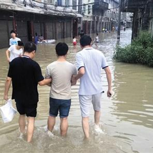 2016年9月,浙江苍南县雨季,警方趟着城中积水将犯罪嫌疑人杨琛送进看守所。警方供图