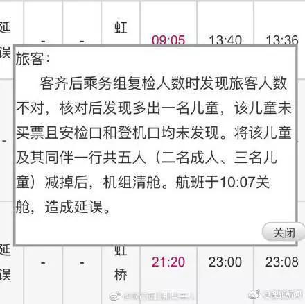 同机乘客宋先生告诉记者,当时有一个意思小孩家长的男子向机组人员解释称,以为1.2米一下的孩子不用买票,并向工作人员提出“可以现在补票吗?”,工作人员表示无法补票后,未购票儿童及通行人员被机组人员要求下机接受询问。随后,同机的其他乘客也被要求下机重新安检,原定6:55起飞的飞机被延误到11:59才重新起飞。
