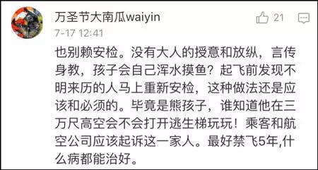 另据@中国日报 官方微博消息,7月18日,民航局航空安全办公室副主任李继承回应,16日首都机场4岁儿童未购票乘机,导致延误5小时事件;经调查,五名旅客系两名成人和三名儿童,均是首次乘坐飞机,误以为1.2米以下儿童不用购买机票,无故意逃票行为,不构成违法犯罪行为。当日由于天气原因,航班已有延误。在延误的五小时中,由于未购票而导致的延误约1.5小时。