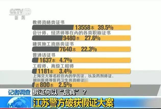 在本案涉嫌已经办出的34260本假证书中:教师资格类的证书13558本,占39.5%;包括会计师、经济师等在内的各类职称证书9480本,占27.6%;建筑施工资质类的证书7640本,占22.3%;普通话证书1637本,占4.7%;工程师、高级工程师1181本,占3.4%;此外还有包含上海交大等名校在内的学历证,以及药剂师证、眼科医师等医药卫生类资格证近800本,占2.5%。