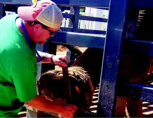 本报讯(记者袁剑锋文/摄)在动物园里圈养的大象,每天行走距离有限,也不用费心去寻找食物,活动量锐减,导致大象脚掌的角质层和趾甲过度生长,影响生活舒适度。近日,太原动物园邀请有20多年饲养大象经验的动物专家玛格丽特和布莱恩,从美国赶来为大象修脚。