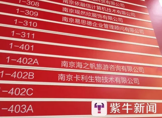 7月20号,紫牛新闻记者按照沈女士提供的地址来到南京市创意园东八区一栋402A室,不过这里并没有“江苏金色假日国际旅行社有限公司”的招牌,通过一楼的指引牌可以看出,同一地址标注的是“南京海之帆旅游咨询有限公司”。