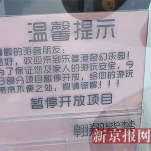 记者在园内看到,仍有大量游客游玩,多为成年人携带儿童。“翱翔紫禁”游乐项目是一处十余米高的蓝色建筑,目前项目大门关闭,门口放着“设备检查,暂停开放”的提示牌。项目出口处多位工作人员均称,不了解项目暂停开放的具体原因。