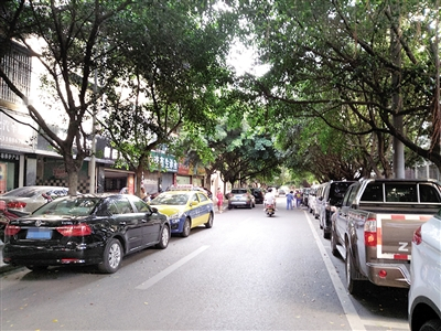 因临近行政服务中心等几个重要部门,该路段成了前来办事市民停车的首选位置,加之附近小区居民停放车辆,该路段除了划定停车位每天被停得满满当当以外,人行道和公路另一侧也停满了车辆。