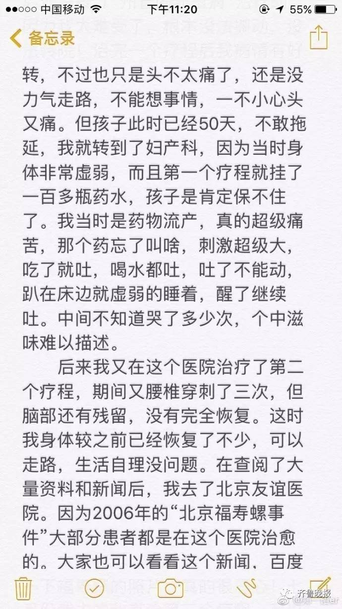 怀孕的她做了六次腰部穿刺,扎了近300瓶水,吃了十几盒打虫药,因为药物和激素作用身体变形,被迫进行了药物人流。