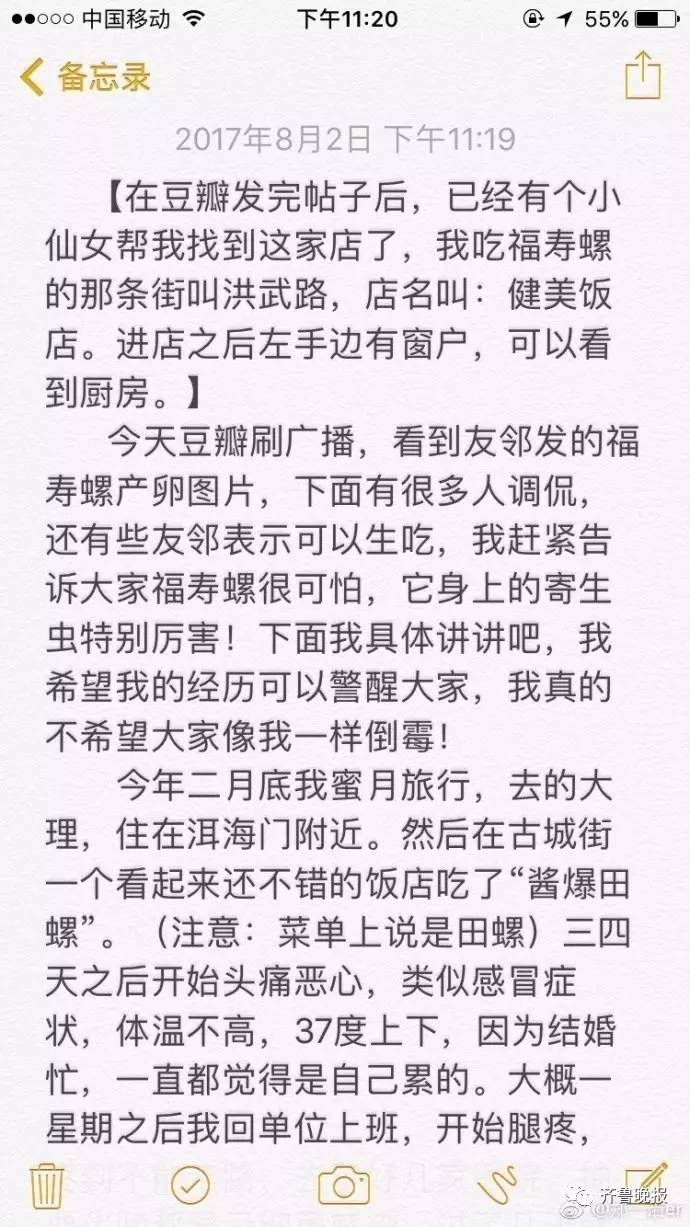 讲述了今年二月底蜜月旅行时误食福寿螺,