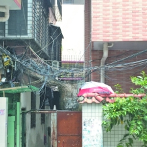 8月4日,记者现场走访看到,从园岭山庄大院内接出多条电线,横跨小巷,其中数股电线经一根破旧电线杆牵引接入该区域自建房屋。记者注意到,该片区电线走线很混乱,巷子里的线路东拉西扯,很像蜘蛛网。