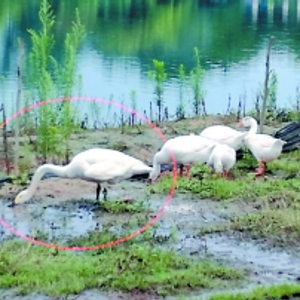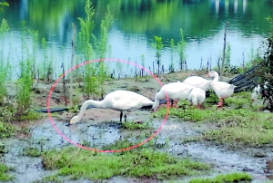 小天鹅(红圈处)“落落大方”地与家鹅共同觅食。