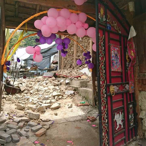 张珊特意去县城买来气球装饰院子大门,并自制了两道拱形的门梁。院门后面,为婚房东墙倒塌现场。墙体倒塌时,大部分气球也爆裂成碎屑。