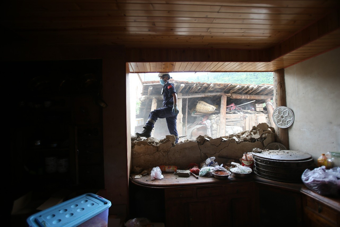 2017年8月10日,九寨沟县上四寨村蓝天救援队正在拆除村内一家北侧危墙。