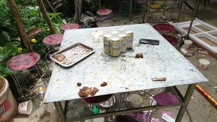 宴席上还留下了村民们吃剩的食物。在逃跑过程中,5位村民被掩埋在墙体下,屋主在瓦砾中找到了一台被压碎的手机,已无法开机。