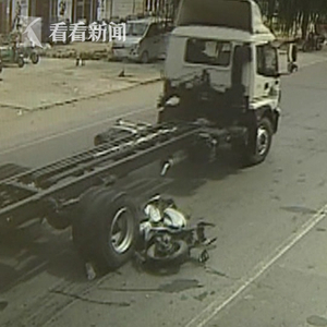 监控视频中,一名男子骑摩托车在公路上行驶,突然被从旁边经过的货车撞倒,货车司机发现异常后紧急刹车,可是骑车男子还是被轧在了货车的车轮下,他的一条腿被死死卡住。