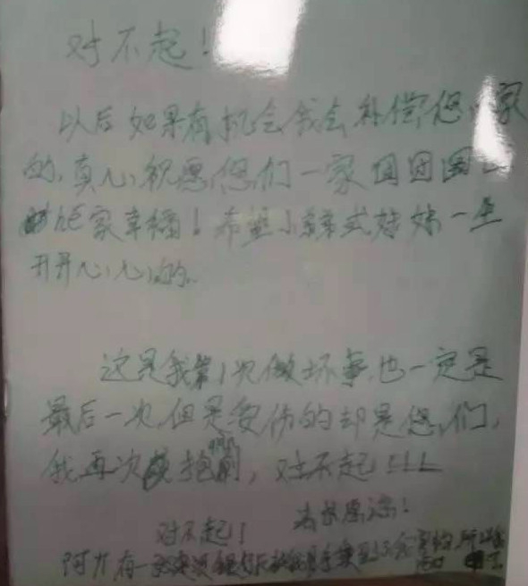 小偷作案现场留拼音纸条:对不起 有机会再补偿