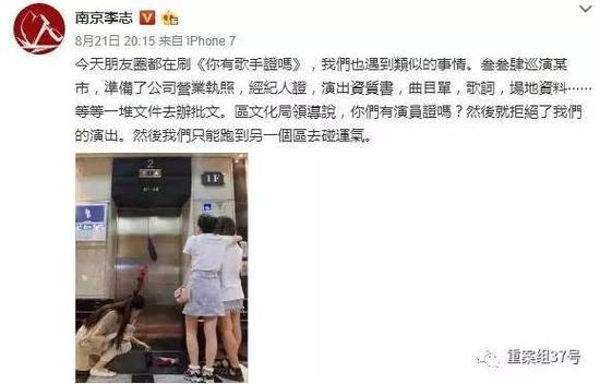 音乐人李志8月21日在微博发文称,“今天朋友全都在刷《你有歌手证吗》,我们也遇到过类似的事情。”并称他曾在巡演中的某一站因无法出示证书,而导致团队被拒绝演出。