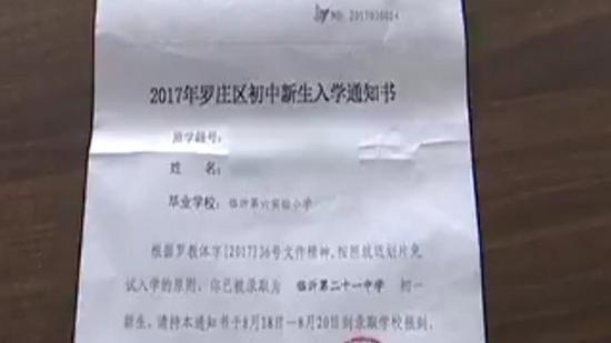 据临沂市罗庄区的葛女士介绍,自己的孩子接到了临沂市罗庄区教育局发放的入学通知书,上面显示,学生已经被临沂市第二十一中学录取。但是在8月20号,学生却被学校拒绝登记入学。