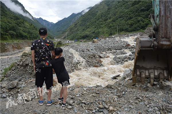 车开了不到5分钟,就看到赵亮正带着8岁的儿子站在路边,“路又断了,上不了山…”赵亮皱着眉头。原来,连日大雨,山上的碎石路被洪水冲断,形成了一条约两米宽的小河沟,湍急浑黄的洪水咆哮着发出巨大声响。之所以说是“又冲断”,是因为就在今年8月,这条路就被冲断了3次。赵亮的合伙人,当地村民黄昌明无奈地说,自己在这里生活了几十年,还是第一次看到山上发那么大的洪水。