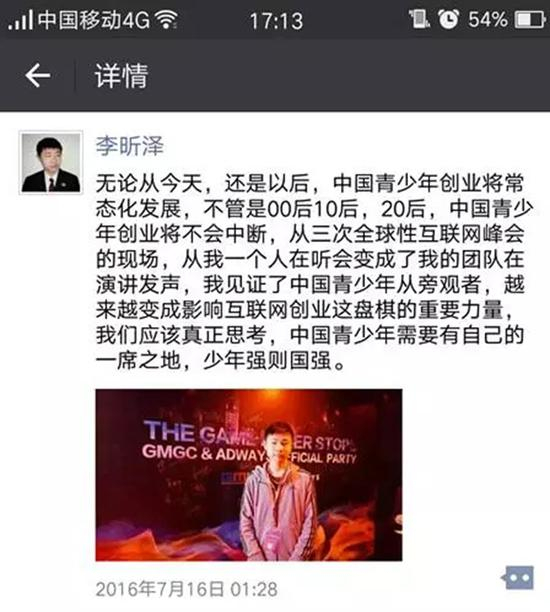 2016年李昕泽参加全球互联网峰会后,发朋友圈感慨。 李昕泽朋友圈截图
