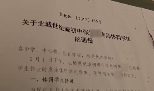 北城世纪城初级中学副校长陶有升表示,事发后,他们也与张老师进行了沟通,具体了解他体罚学生的原因。“他当时他的想法肯定是想好,因为他刚刚来啊他自己的话说他说我刚刚开始的吧,就想让学生规范规矩一点,就是他这种方式,可能太过激了,就造成了很不好的影响。”