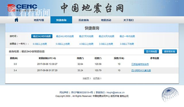 今天下午1点45分左右,中国地震台网中心发布消息称,9月6日13时39分,在盐城东台市附近发生3.0级地震,震中位于北纬32.64度,东经120.56度,震源深度10千米。