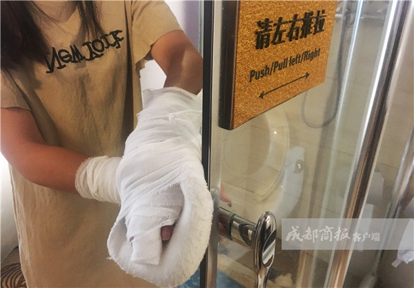 成都商报客户端9月10日报道,刘女士本来的计划是在成都的酒店住一晚,第二天回江苏陪儿子,不想行程被一扇破碎的玻璃门打乱了。刘女士称,8月19日晚洗完澡的她准备拉开玻璃门,“哐当一声”玻璃门碎裂,玻璃溅到她身上后,致其手指、脚背多处受伤,并住院治疗9天。