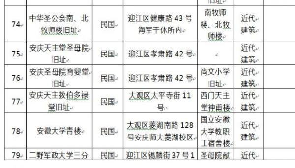 除严凤英旧居、诸永盛酱园旧址、合记义和染坊旧址、雷家老屋传统民居、劝业场旧址等之外,安徽大学青楼、国营安庆香皂厂旧址等也被公布为保护性建筑。