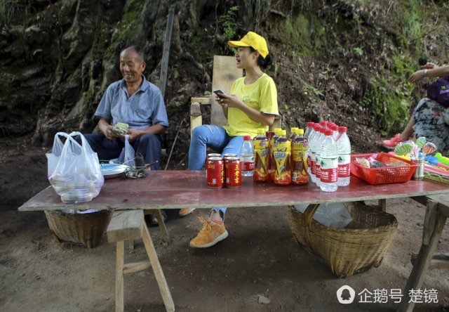 从武汉来的彭女士在得知老人的价格后,拿起饮料:" 爹爹!你看着,这个矿泉水卖 5 块!红的 8 块!夏天拿到水里冰一下,买的人更多。" 旁边有人开玩笑:" 你别把人家爹爹教坏了。" 彭女士回道:" 这不是教坏,你背水爬上来试试,要对得起付出的体力。"