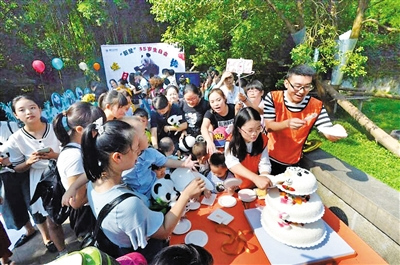 就在“新星”心无旁骛地吃竹笋时,旁边响起生日快乐歌。伴随着歌声,一个用玉米糊、奶粉、竹笋等定制的三层生日蛋糕送了上来。“新星”充满了好奇,围着生日蛋糕转了几圈,不知怎么下口,随后放弃了吃蛋糕的想法,再次用它那已经掉了两颗下门牙、坏了两颗下门牙的嘴剥着竹笋。