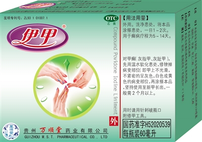 现在您有了灰指甲,请别灰心!请使用国药准字药品——伊甲牌复方聚维酮碘搽剂(国药准字H52020539),贵州万顺堂药业的专利产品(发明专利:一种治疗皮肤(甲)病的药物组合物ZL200810170830.3),专业治疗灰指甲!伊甲®复方聚维酮碘搽剂能软化角质层,有效增强药物渗透力,对病原真菌具有杀灭作用。涂搽本品于患甲,保持干燥通风,不要包扎,坚持使用至新甲长出。早治疗,少无奈,简单又方便。每天一次,在局部形成长效药膜,坚持治疗有良效。