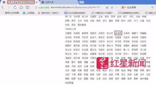 在1995年的高考中,徐海燕如愿考入北京大学的生命科学学院,红星新闻检索发现,她的名字永远留在了该学院的校友名单上(见下图红框)。