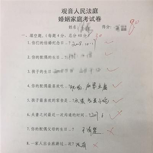 离婚之前,先做份考卷?9月14日,一份命题人是主审法官、评卷人是原、被告的“离婚考卷”在宜宾县人民法院观音法庭出现。法官称,通过让原、被告夫妻做题考试,可以对双方感情做一个考察,60分以上初步表明有挽回余地, 60分以下可以初步认定婚姻关系岌岌可危。